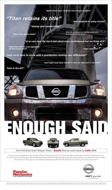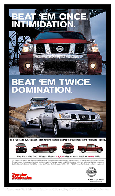Nissan Truck print ads featuring Popular Mechanics Magazine endorsement. (Click to enlarge image)